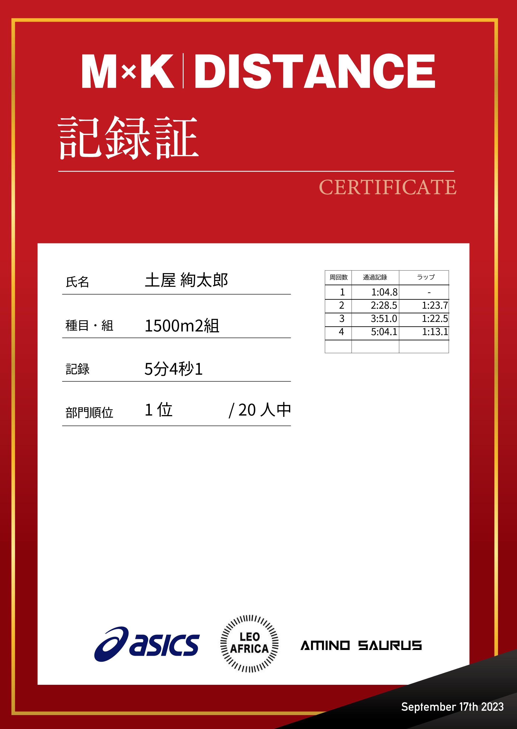 | 1500m | 5:04.1 | 1:13.1 | 1 |