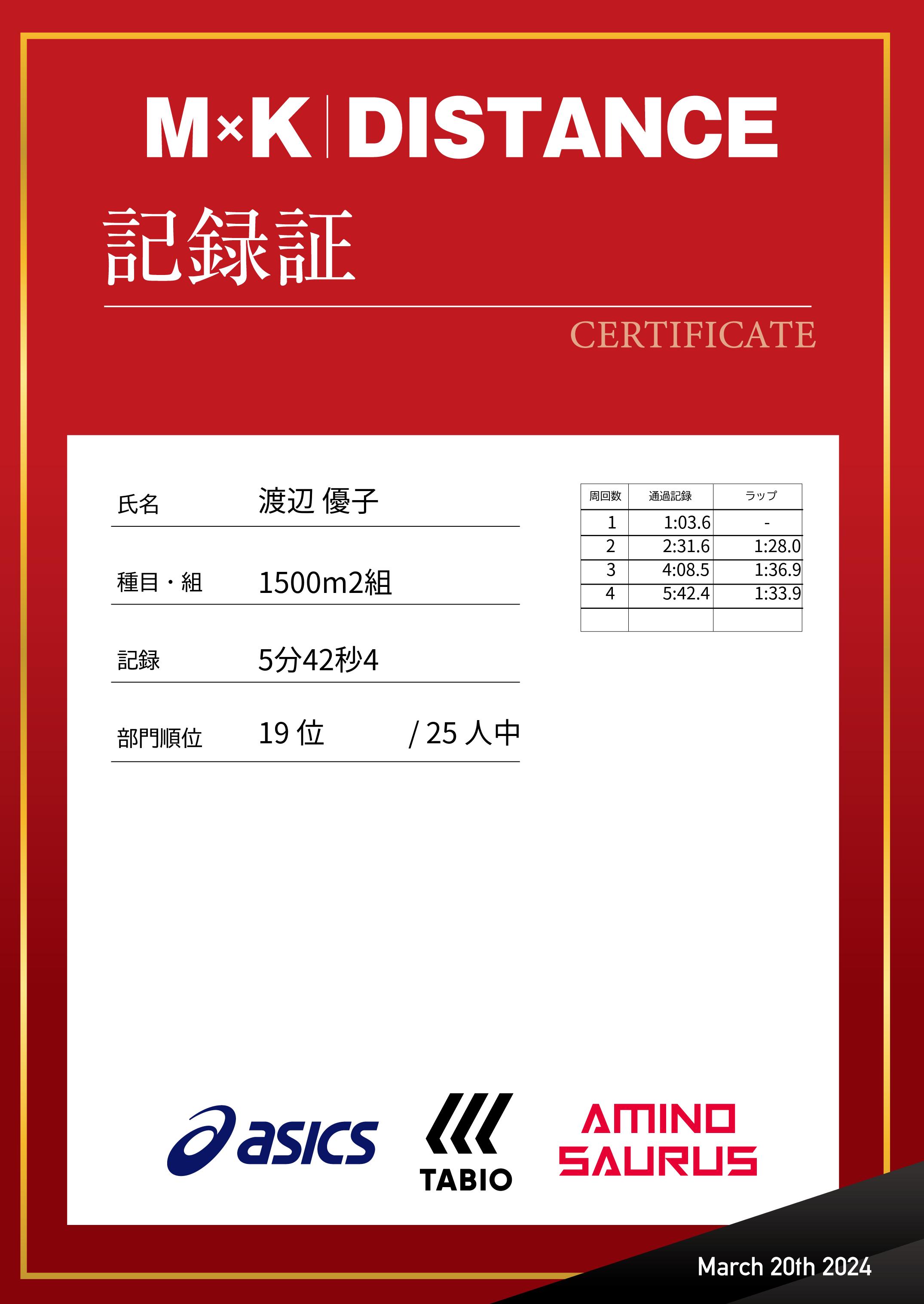 | 1500m | 5:42.4 | 1:33.9 | 19 |