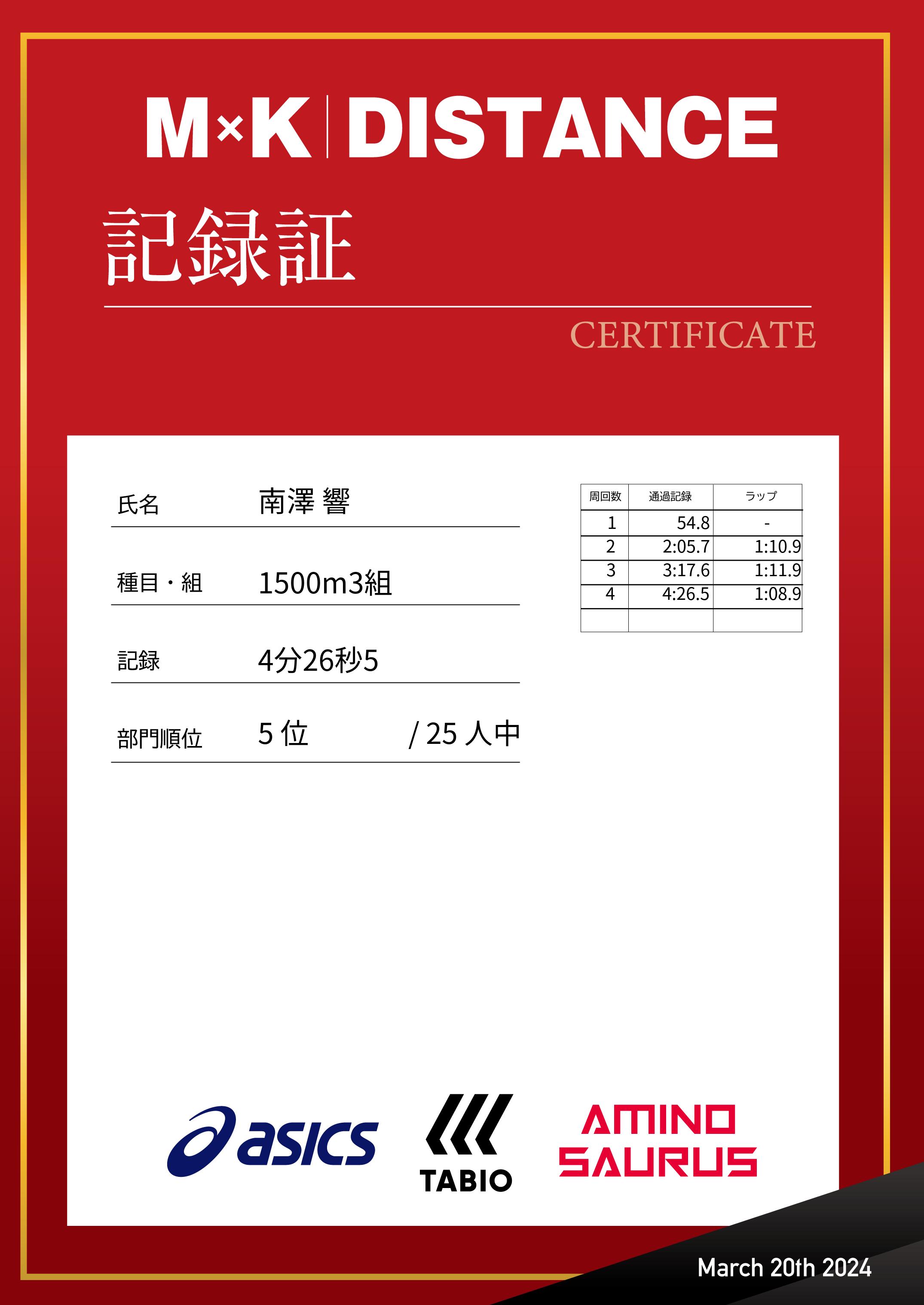 | 1500m | 4:26.5 | 1:08.9 | 5 |