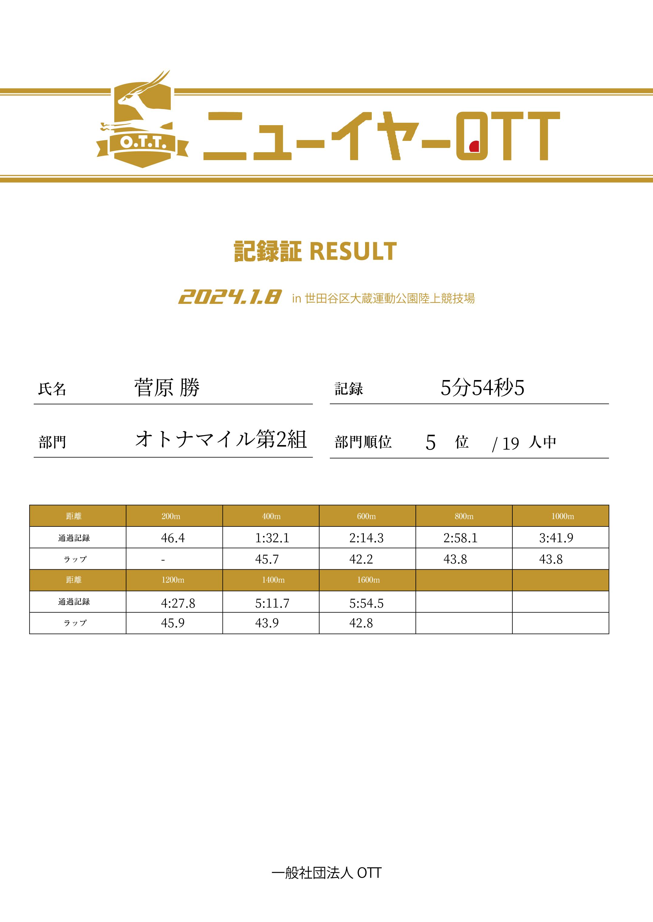 | 1200m | 4:27.8 | 45.9 | 5 |