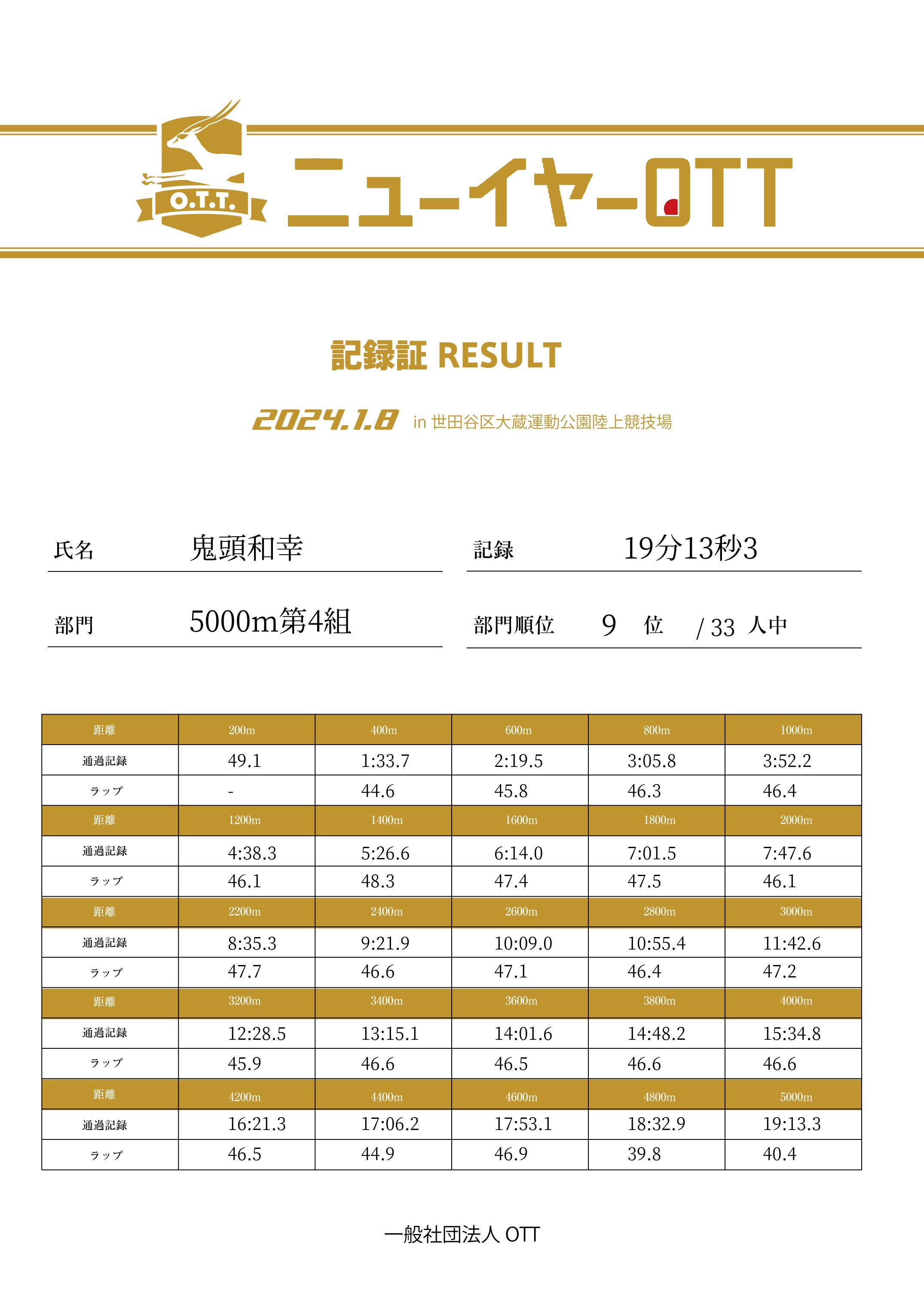 | 5000m | 19:13.3 | 40.4 | 9 |