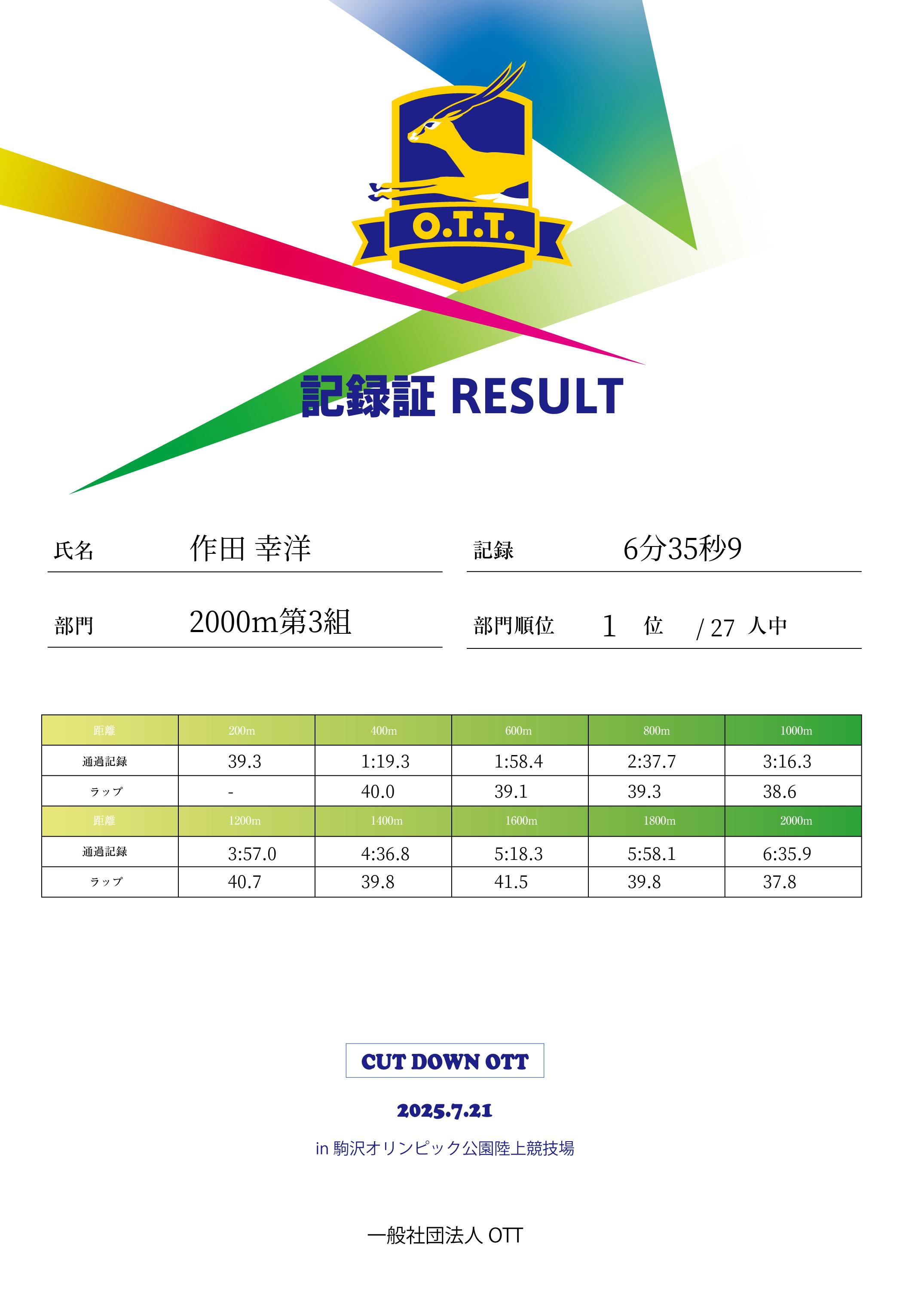 | 1800m | 5:58.1 | 39.8 | 1 |