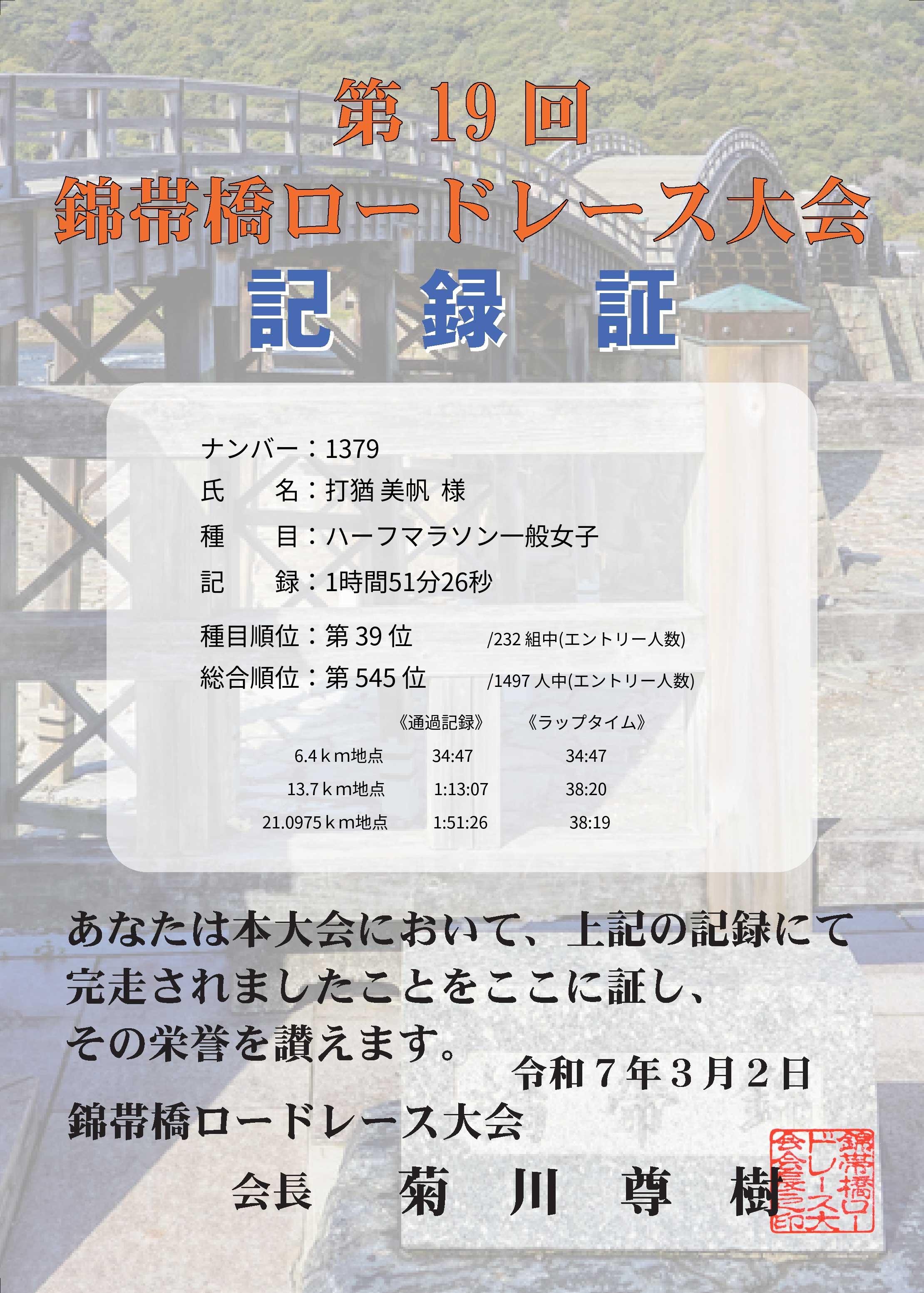 | 21.0975km地点 | 1:51:26 | 38:19 | 17 |